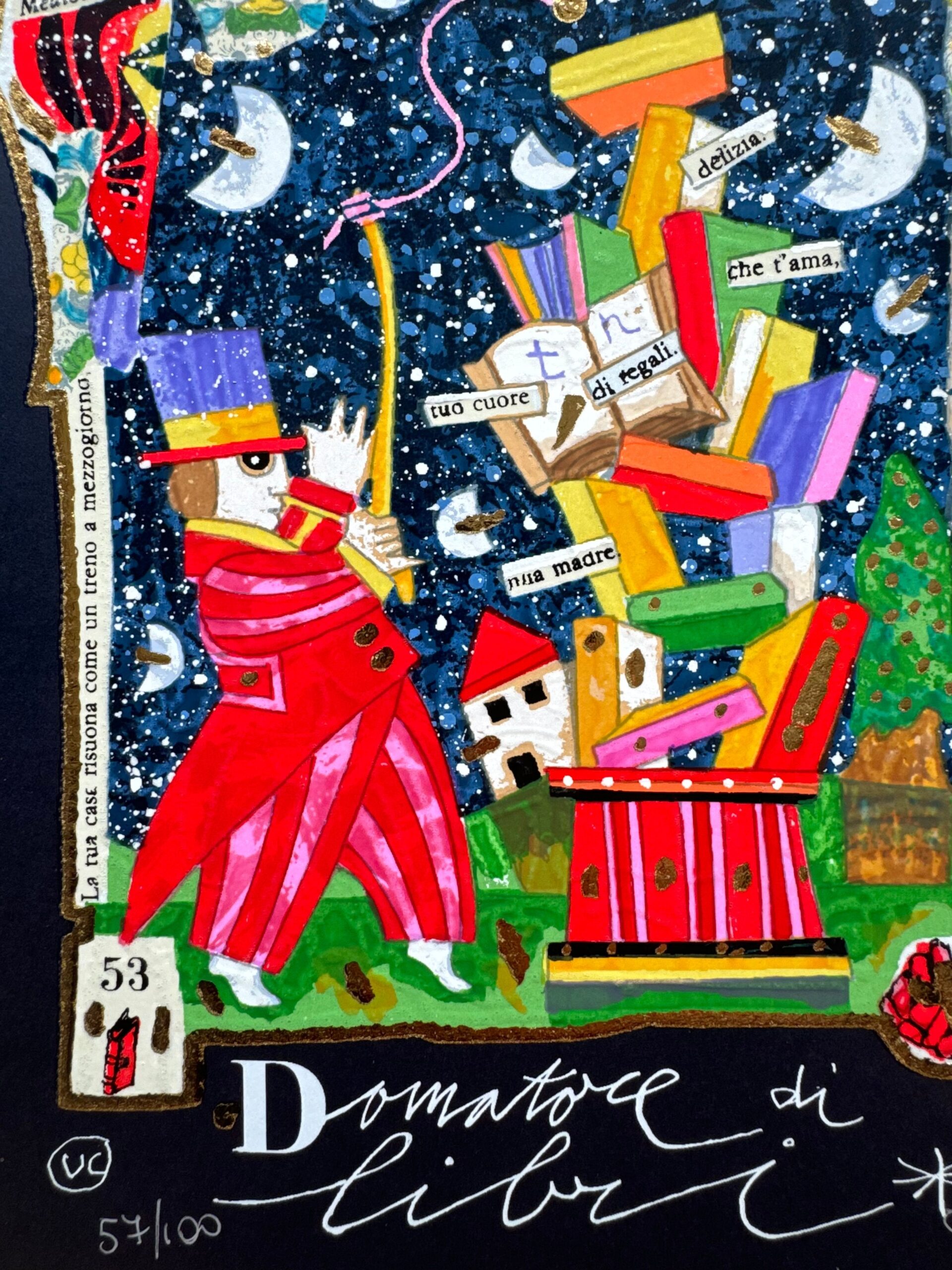 Scopri l’incanto di un’opera d’arte unica del Maestro Francesco Musante. Nato a Genova nel 1950, Musante ha saputo evolvere la sua espressione artistica da sperimentazioni astratte a opere figurative, approdando infine al suo stile inconfondibile caratterizzato da personaggi buffi e atmosfere surreali, arricchite da frasi poetiche e riferimenti letterari.