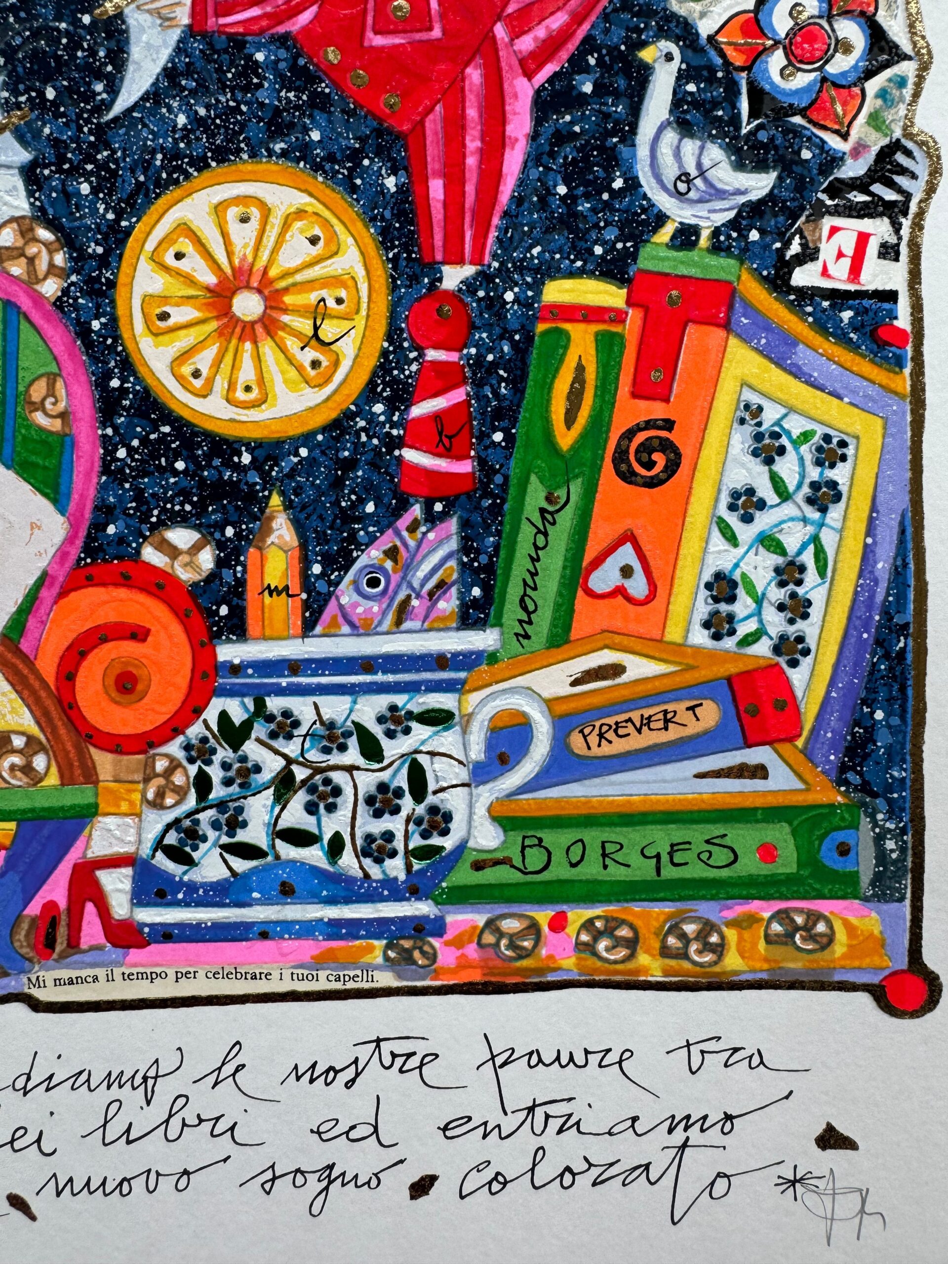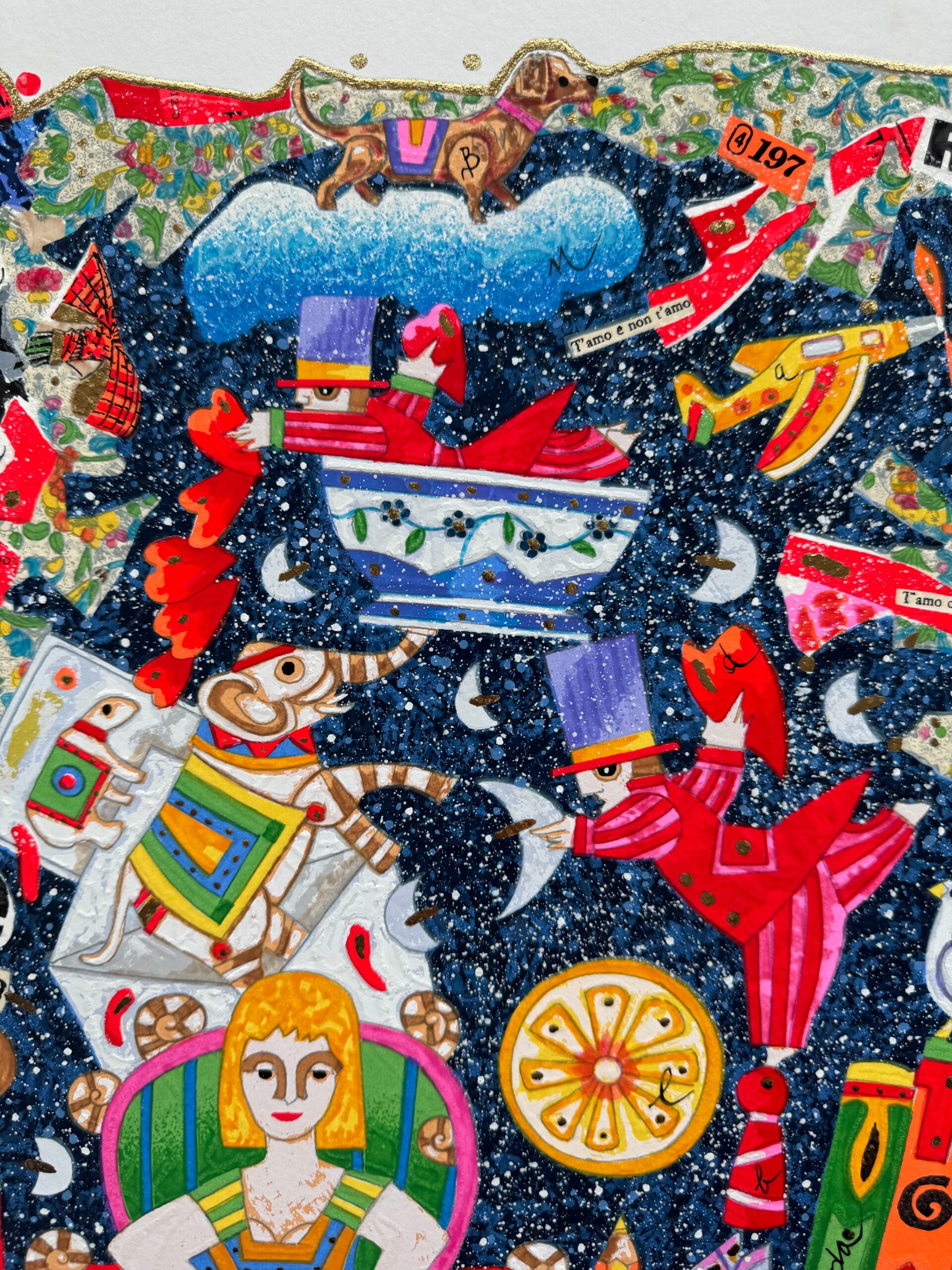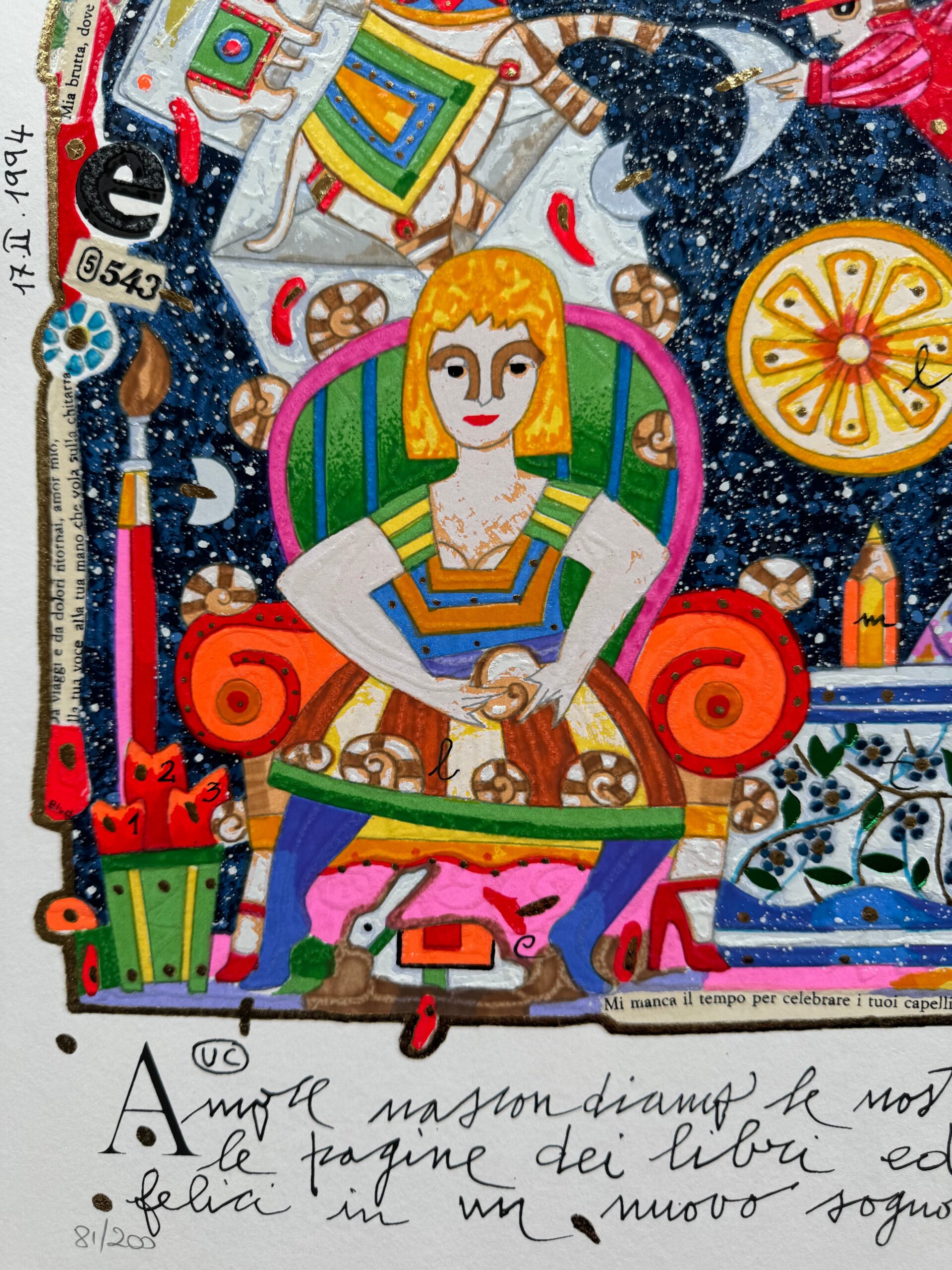 Scopri l’affascinante mondo di Francesco Musante, artista genovese classe 1950, le cui opere dagli anni ’80 narrano storie fantastiche con i suoi iconici ‘omini’. Questa splendida serigrafia polimaterica, arricchita da foglia oro e glitter, rappresenta un’opportunità unica per collezionare un pezzo d’arte vibrante e suggestivo.
