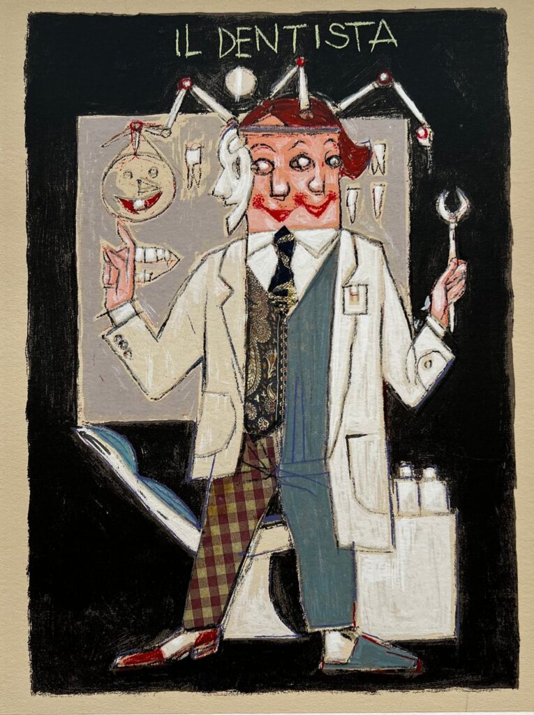 Il geometra di Paolo Fresu è una serigrafia polimaterica arricchita da interventi manuali in stoffe e collage, realizzata su carta.