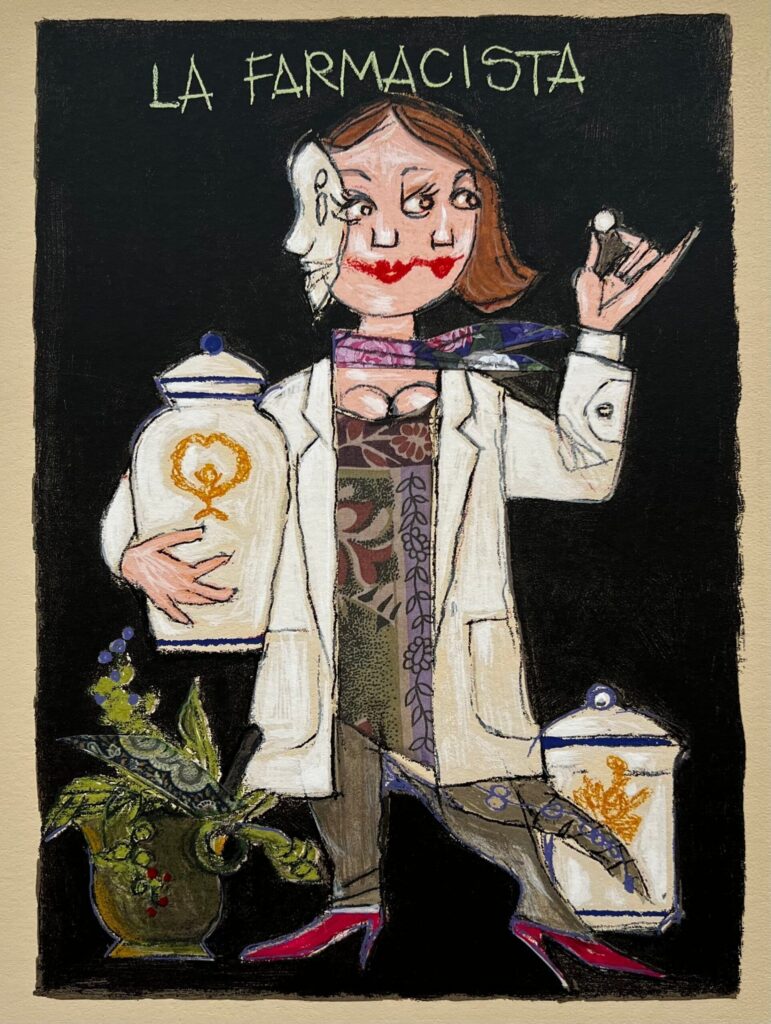 Il Medico di Paolo Fresu è una serigrafia polimaterica di grande fascino, arricchita da interventi manuali di stoffe e collage.