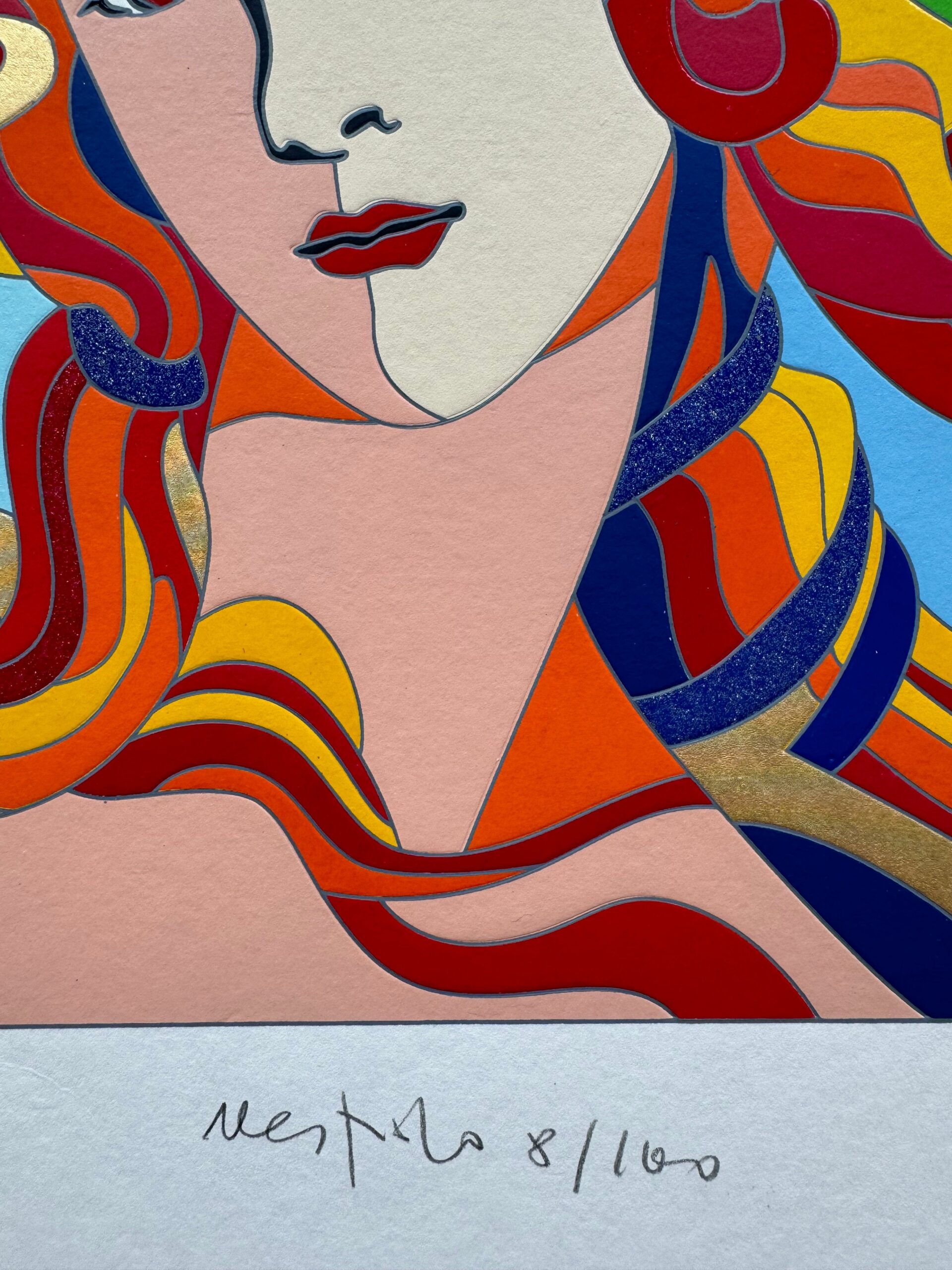 Con dimensioni di 40×40 cm, quest’opera fa parte della prestigiosa cartella “The Woman’s face”. Ogni esemplare è numerato e firmato, accompagnato da un certificato di autenticità che ne garantisce l’originalità e il valore collezionistico. La tiratura limitata a soli 100 esemplari, più le prove d’artista (C), rende questa creazione un pezzo d’arte esclusivo e ricercato. Perfetta per arricchire la tua collezione o come un regalo di prestigio, questa serigrafia di Nespolo è un vero gioiello per gli amanti dell’arte contemporanea.