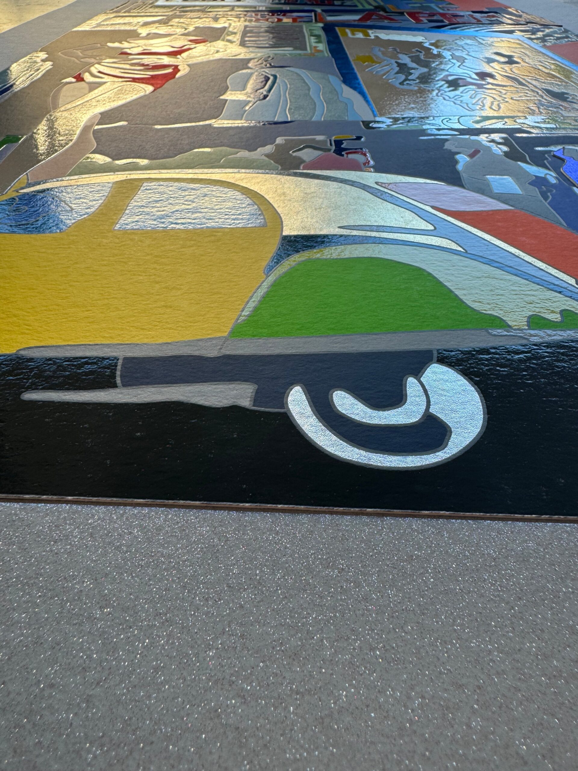 Questa creazione, parte di una TIRATURA LIMITATA, misura 70×120 cm e si distingue per gli interventi manuali che la arricchiscono: collage, schiaccio a secco, glitter, floccaggi e l’eleganza di foglia oro, argento e blu.