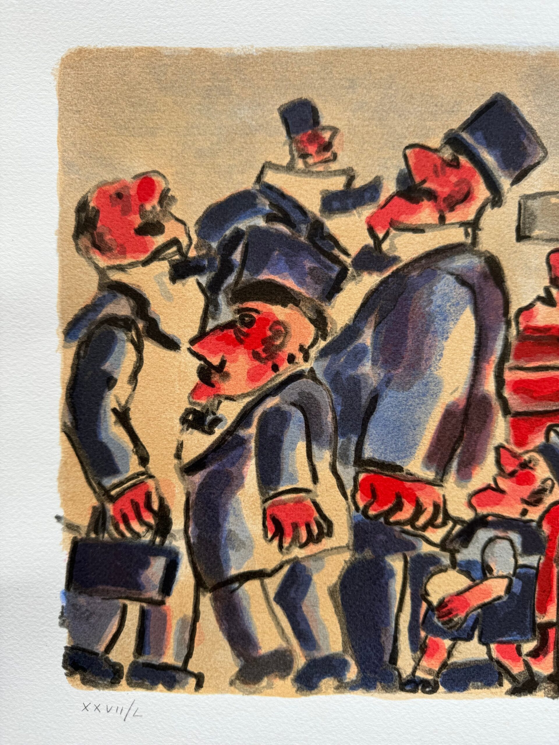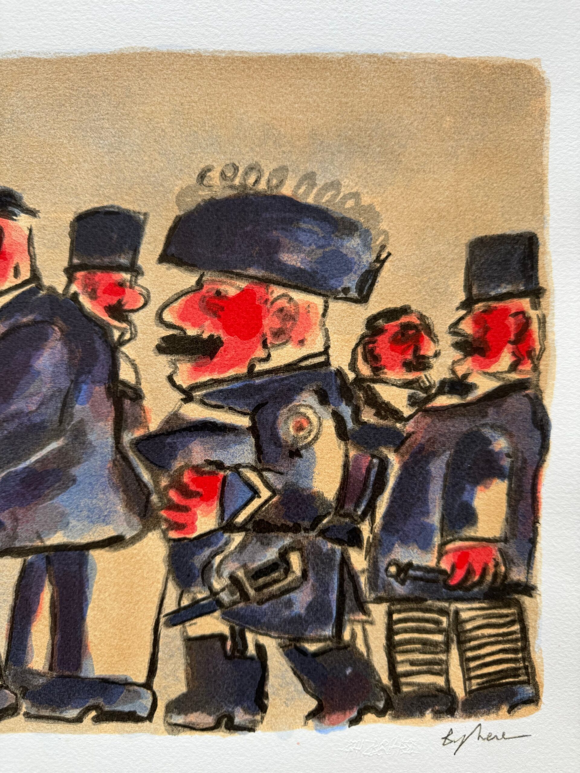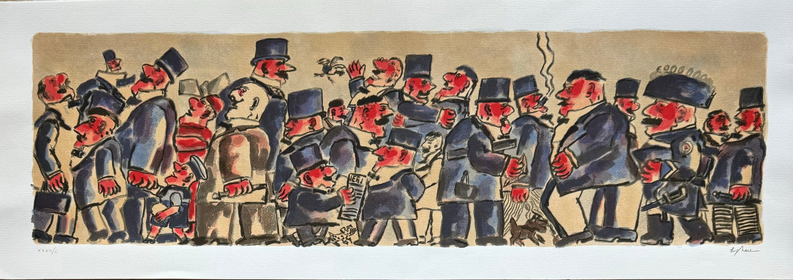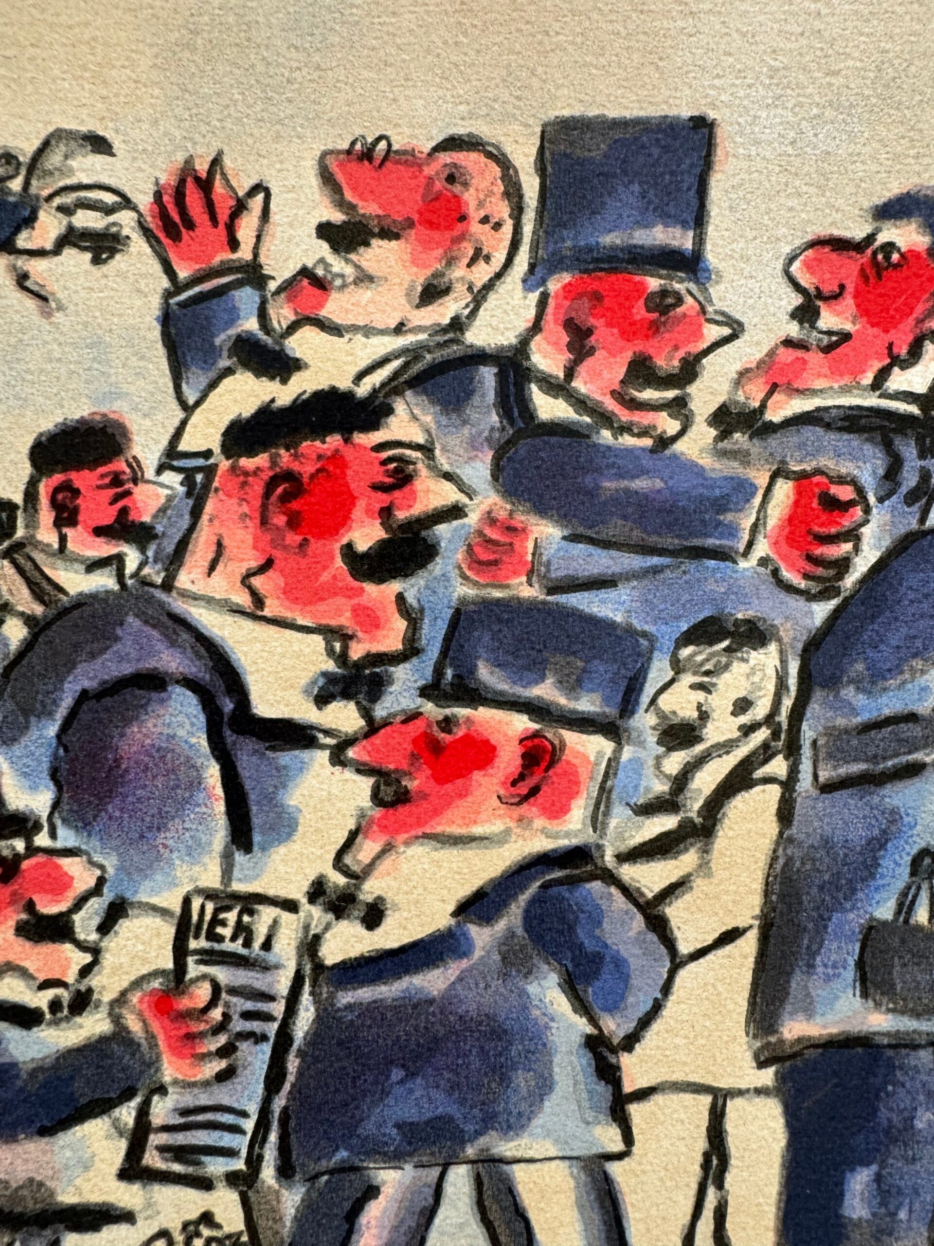 Quest’opera racconta un momento vibrante e coinvolgente, dove una folla si riunisce attorno a un oratore carismatico. L’interazione tra i personaggi, con le loro espressioni animate e gesti esagerati, evoca un senso di dinamismo e teatralità. Il contrasto tra i colori vivaci e le linee marcate accentua il fermento e l’energia della scena, invitando l’osservatore a immergersi in questo spettacolo di vita.