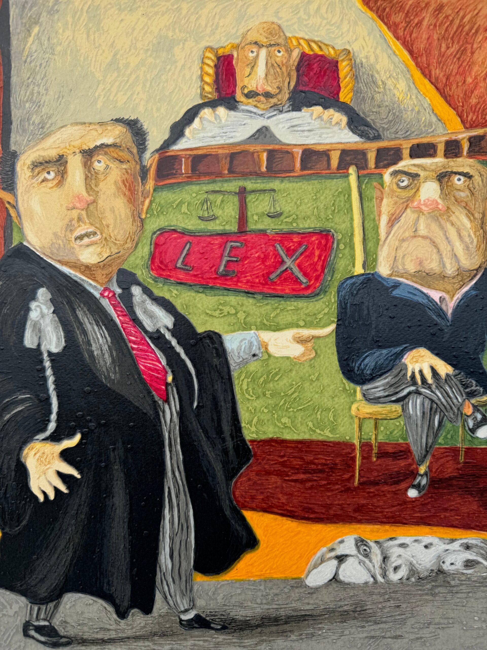 Pino Procopio, noto esponente del figurativismo, trasforma scene di vita quotidiana in opere d’arte surreali, in cui il suo tratto distintivo fumettistico e colorato regala una prospettiva unica e divertente.