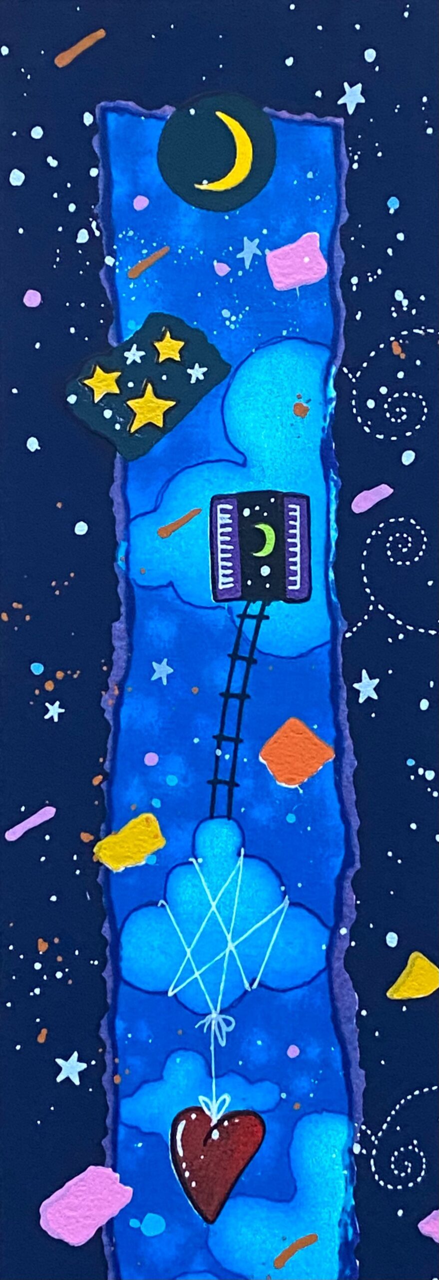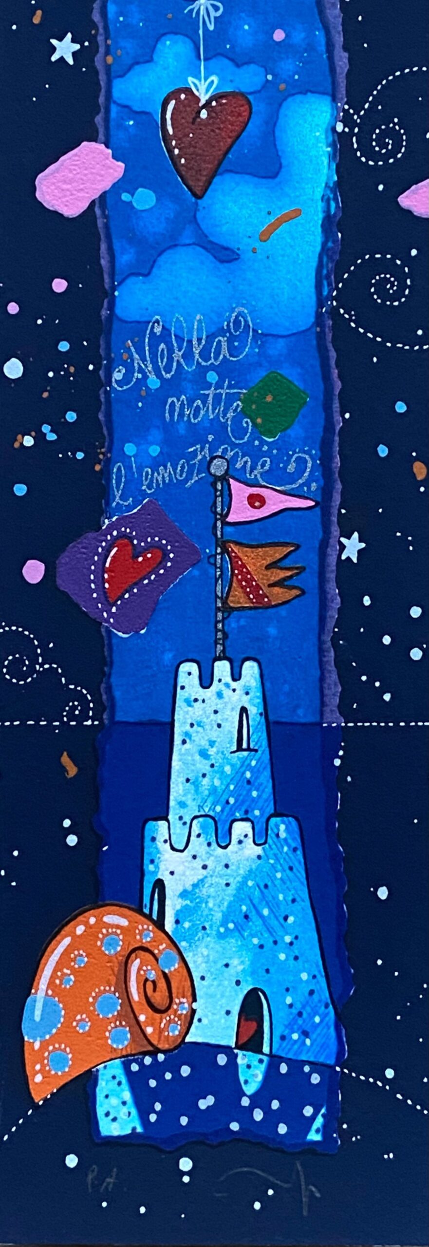 Quest’opera polimaterica, con le sue dimensioni di 10x50cm, fa parte della nuova e suggestiva cartella “Segui la rotta del cuore”.
