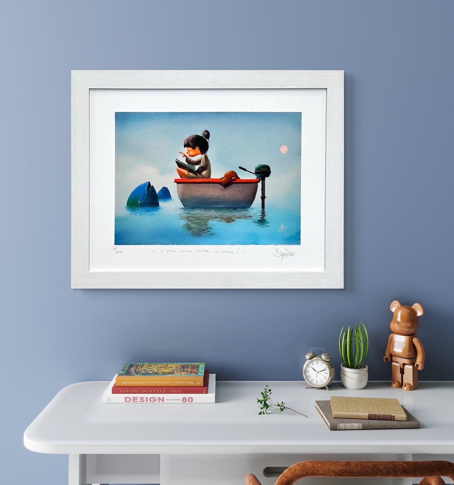 Scegli la comodità: puoi richiedere l’opera con cornice bianca con finitura venata tipo rovere, come mostrato nell’esempio, oppure riceverla senza cornice, spedita con cura in una cartellina.