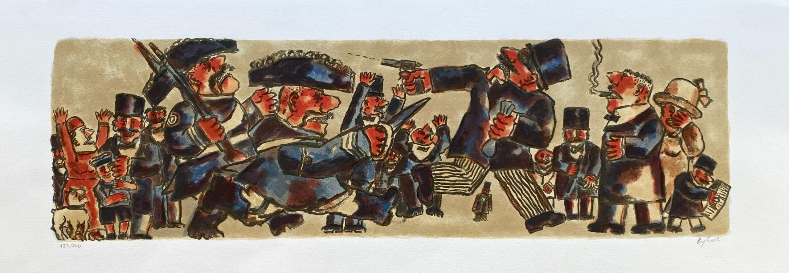 Questa serigrafia su carta, un multiplo in edizione limitata, cattura un momento di vibrante energia e coinvolgimento. Una folla si raduna attorno a un oratore carismatico, le espressioni animate e i gesti esagerati dei personaggi creano un senso di dinamismo e teatralità. I colori vivaci e le linee marcate esaltano il fermento della scena, invitando l’osservatore a immergersi in questo spettacolo di vita quotidiana.