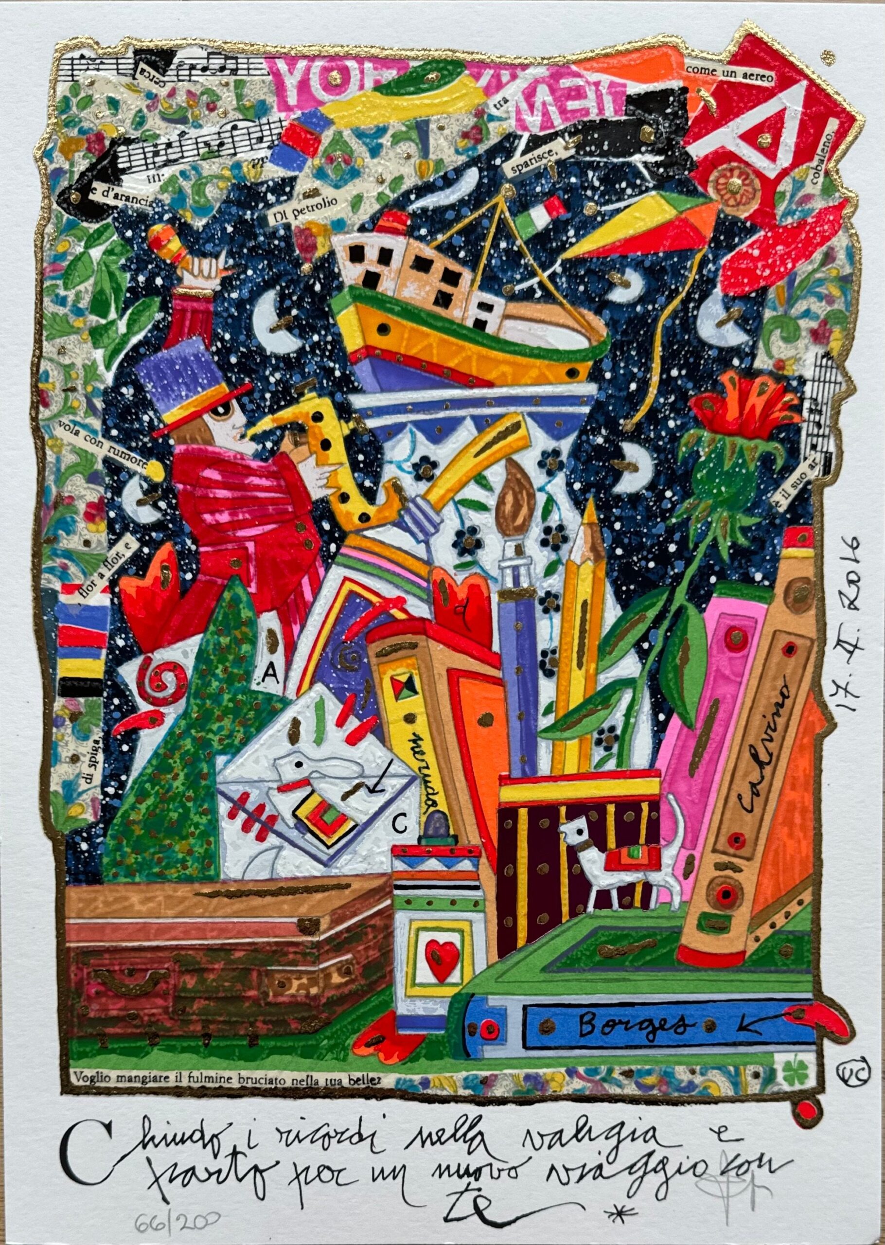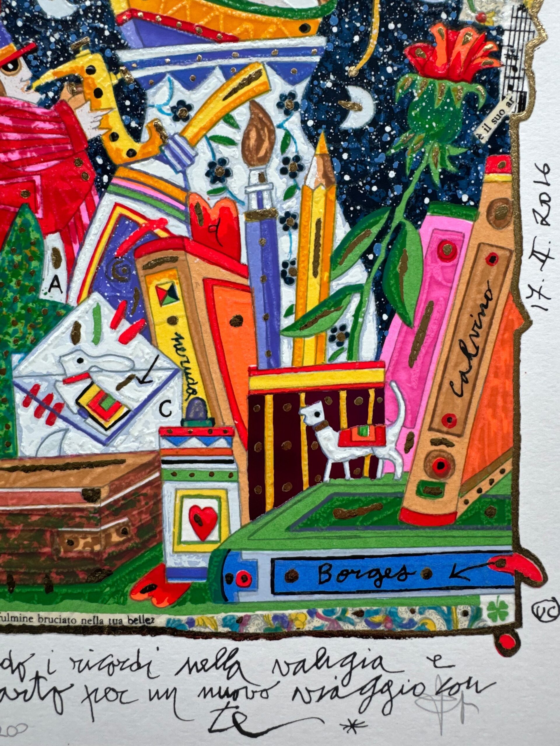 Questa serigrafia polimaterica, disponibile in dimensioni di 25×35 cm, è un perfetto esempio del suo stile distintivo, con l’aggiunta di foglia oro e glitter che conferiscono spessore e texture tattili uniche. Un multiplo in edizione limitata, ideale per arricchire la tua collezione con un tocco di sogno e magia.