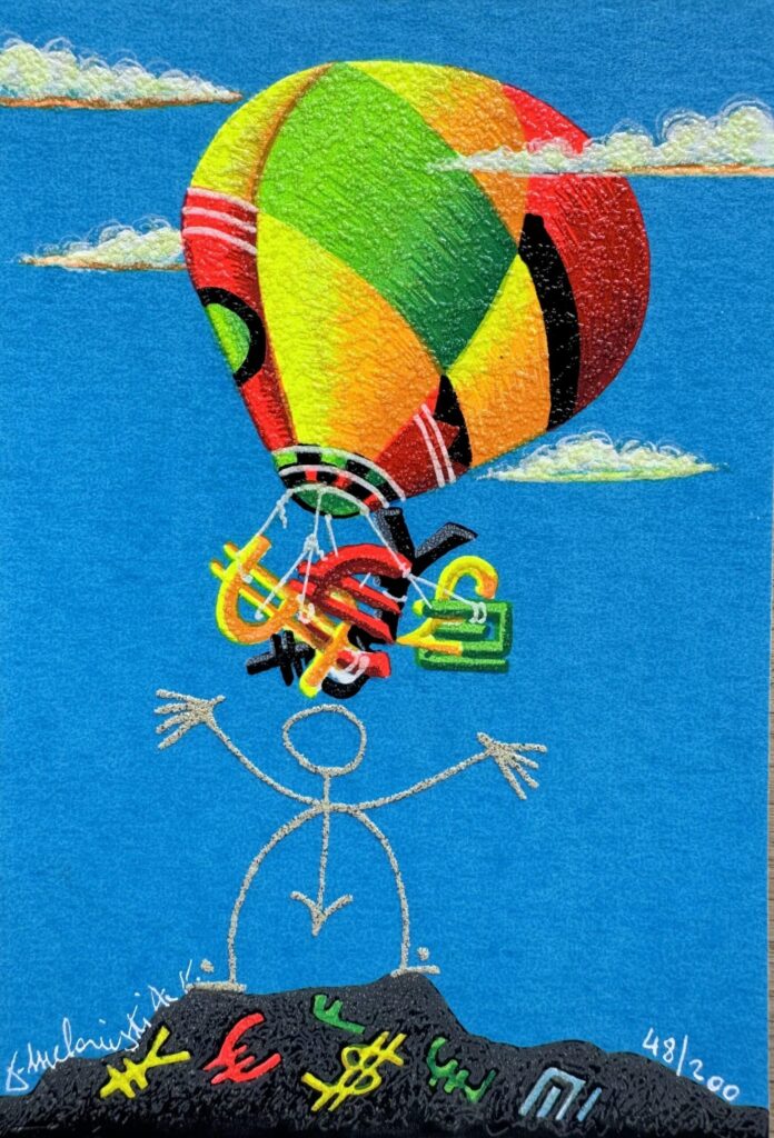 Volo Surreale di Meloniski da Villacidro è una serigrafia polimaterica in edizione limitata, novità assoluta del 2024.