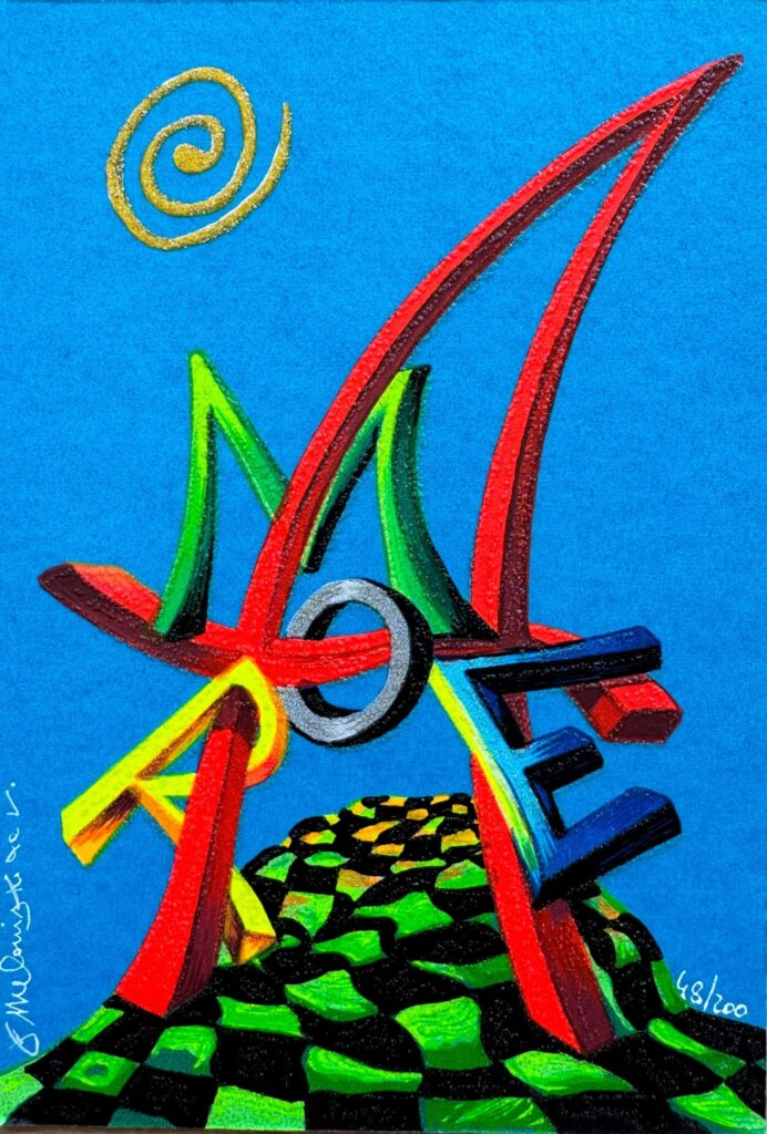 Questa creazione cattura l’essenza onirica e surreale che contraddistingue il lavoro di Meloniski, dove la realtà si fonde con l’immaginazione in un balletto di colori e simboli.